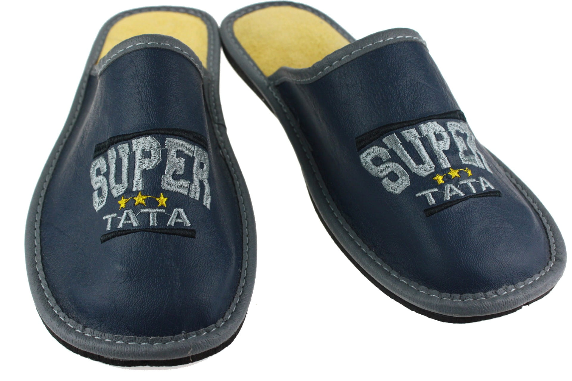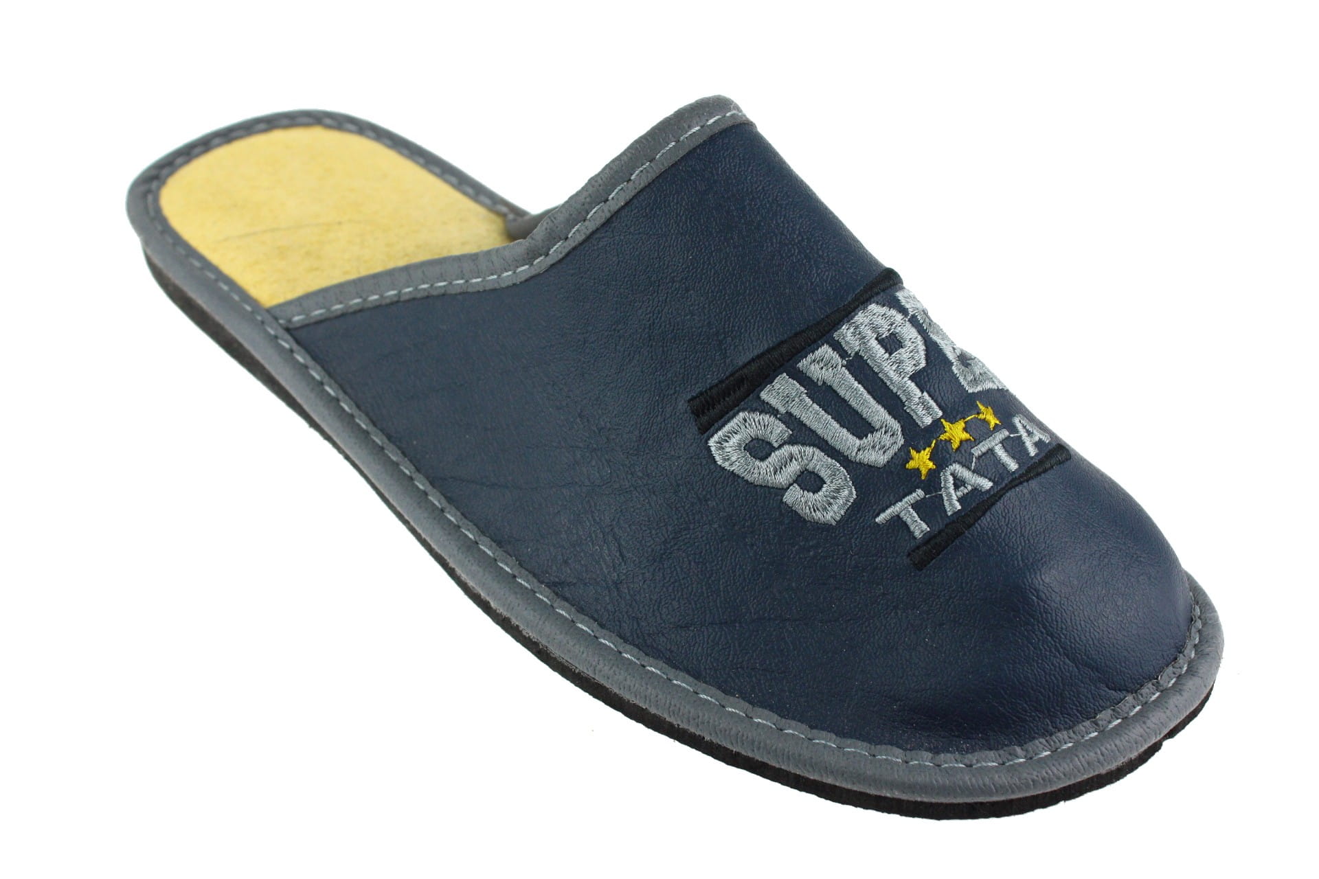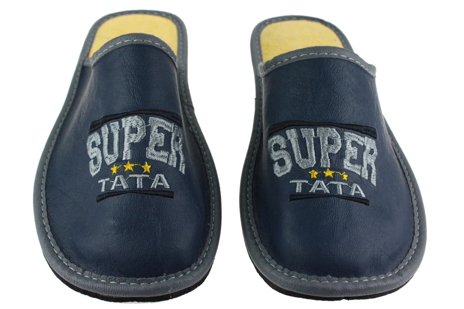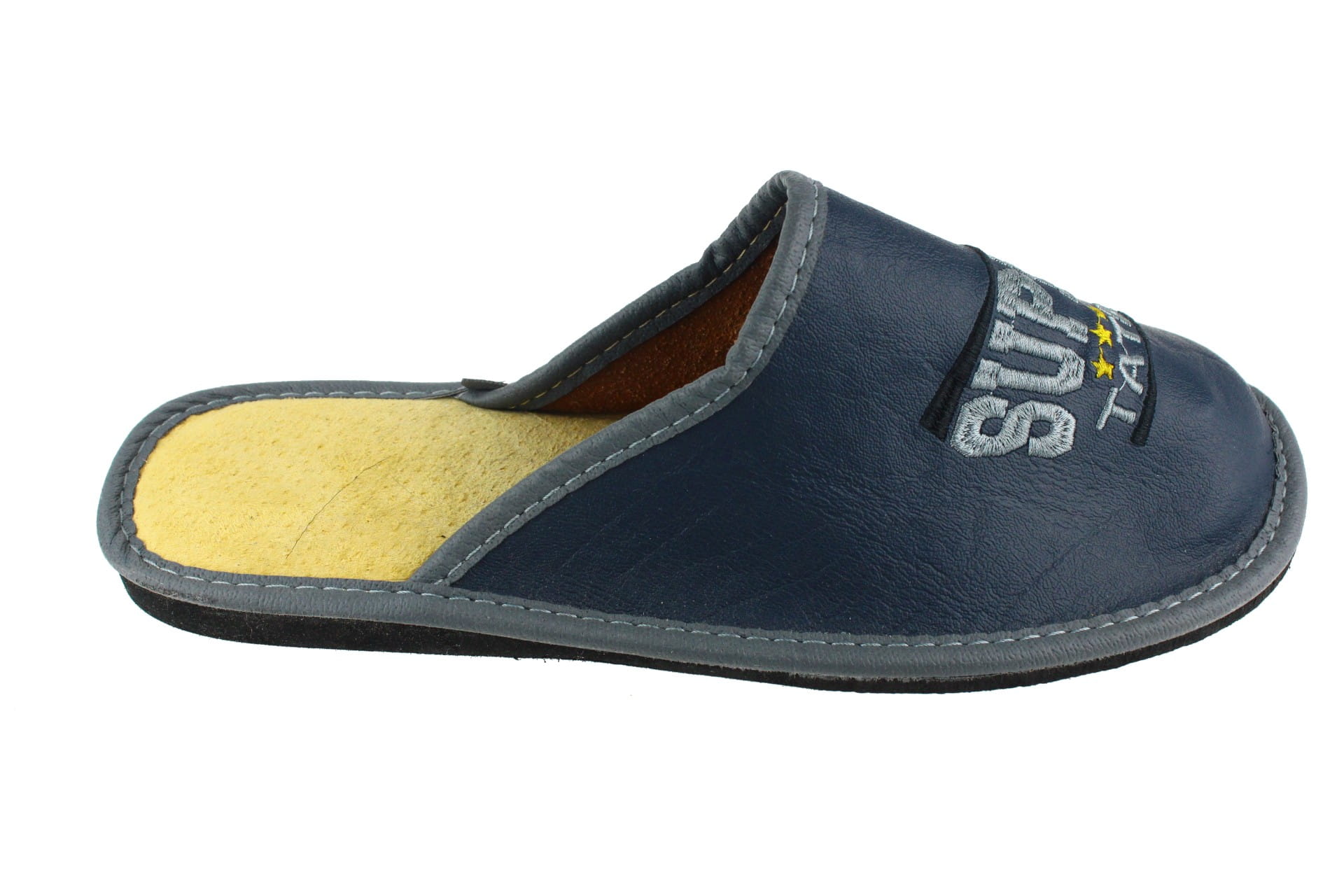 Wykonane z naturalnej skóry w kolorze granatowym. Wkładka skórzana, profilowana. Spód gumowy, antypoślizgowy. Przeznaczone są dla osób, które mają podwyższone przegubie. Są lekkie i wygodne, przeznaczone do użytku domowego. Dzięki temu, że są szerokie, poprawiają komfort chodzenia. Solidne i wytrzymałe.